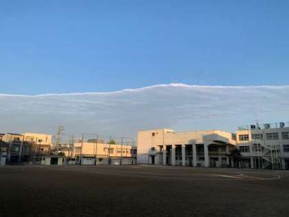 朝、運動場から見た雲はまるで空を半分に分けたようです。