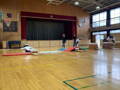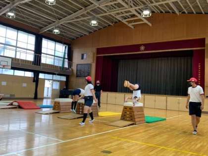 台上前転からの首はね跳びに挑戦しています。