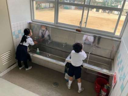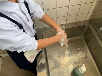 手洗いです。子どもたちは、泡立たせた石けんを使って上手に手洗いを行っています。
