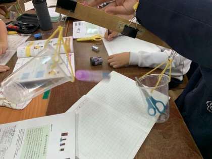 「重さをはかって表そう」と身の回りの持ち物を天秤にかけて比べています。