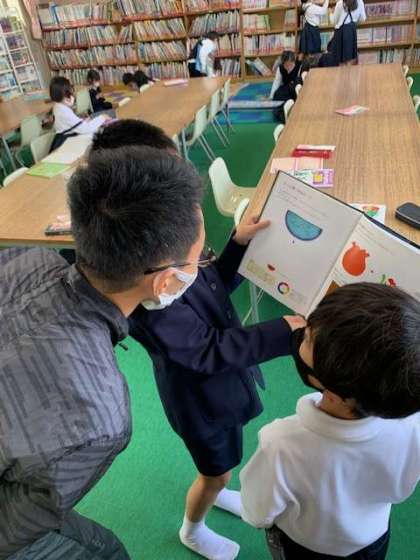 担任の先生に「見てみてっ」と視覚で変化する本を見せてくれています。20秒眺めて、下を見てみると赤いスイカが現れるそうです。