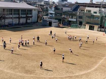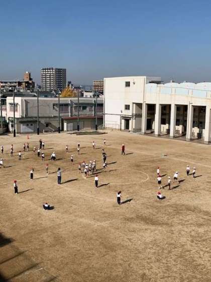運動場で学年で、ボールを投げるドッジボール型のゲームに取り組んでいます。