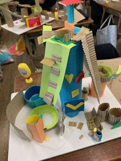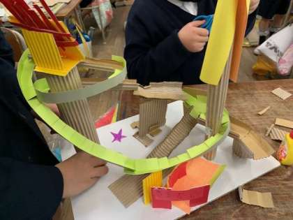 「コロコロガーレ」という題でビー玉を上から落として、コースをコロコロ転がして遊びます。山あり、谷あり、物語ありとおもしろいコースがどんどん出来上がっていきます。