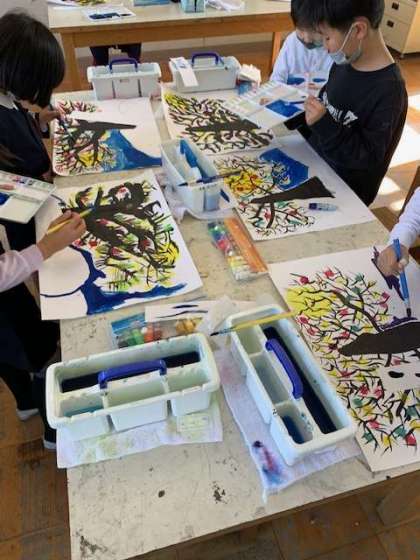 国語科で学習した「モチモチの木」を描こうと、子どもたち一人一人の「モチモチの木」を描いていきます。