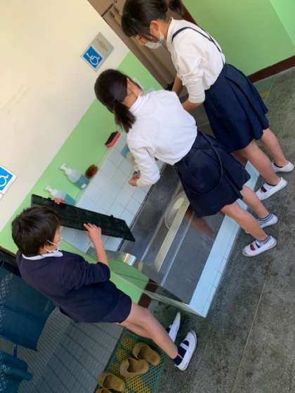 空調のエアフィルターのお掃除です。これもきれいにしていないと教室の空調の効きが悪くなります。大切なお掃除です。