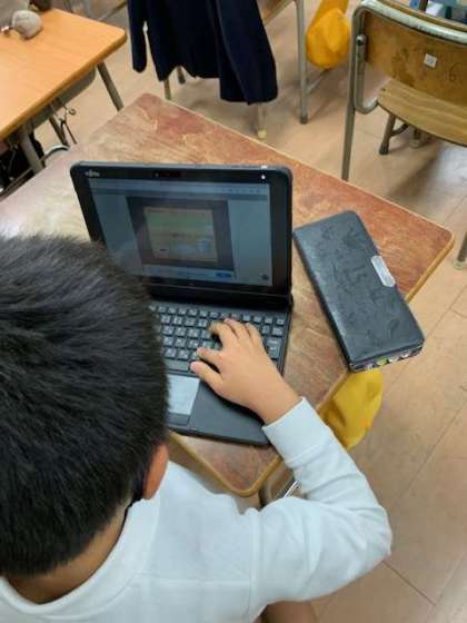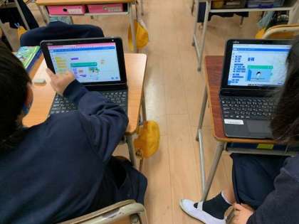 タブレット端末を使って、プログラミング教材に挑戦する子どもたちを見つけました。