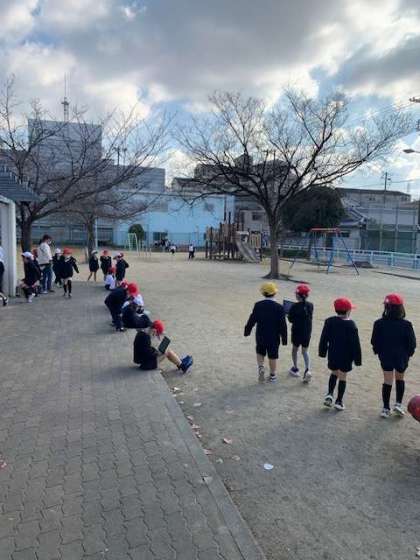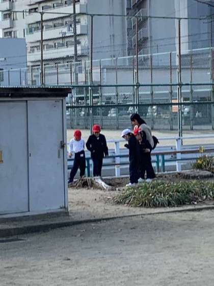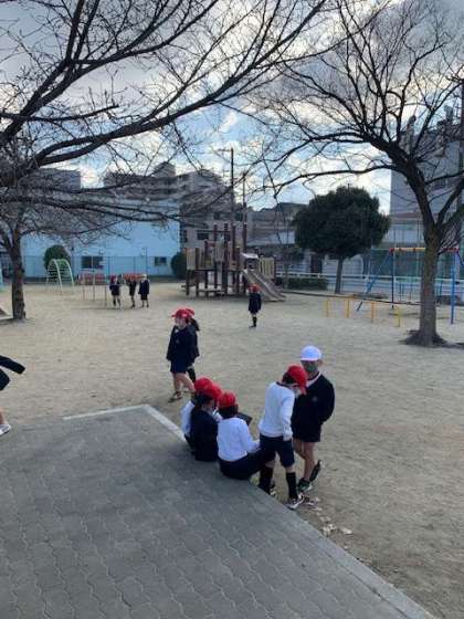 冬の公園たんけんです。春夏秋に比べて、何かちがうものを見つけよう、また公園には何があるかを見つけようと探しています。見つけたものは、学習者用端末で写真を撮って保存して、教室に帰ってからみんなと確認していきます。