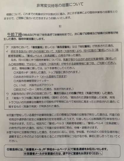 臨時休業措置をとる場合は、午前7時の時点、及び午前7時を過ぎて始業時刻までに、お知らせします。
