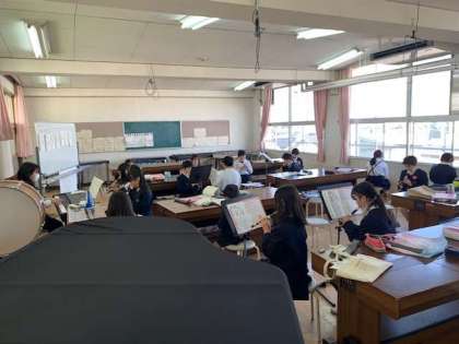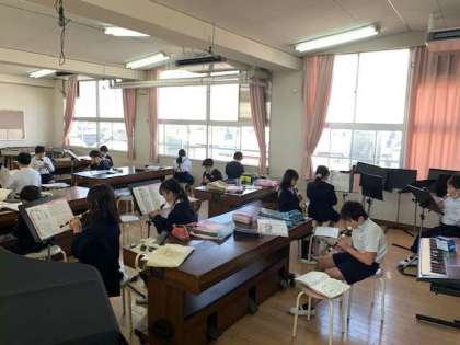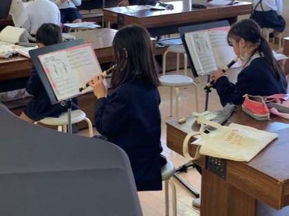 リコーダーの練習に取り組んでいました。換気をして、人とそれぞれの間隔を空けながら吹いていきます。