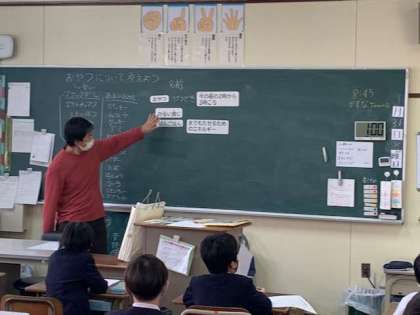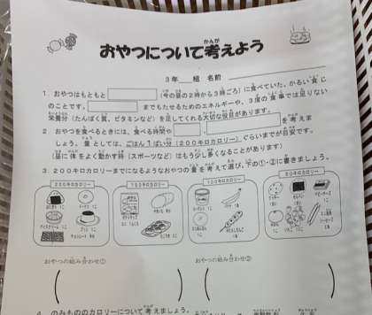 3年生に、食育です。今日は「おやつについて考えよう」とおやつの意味から、習います。