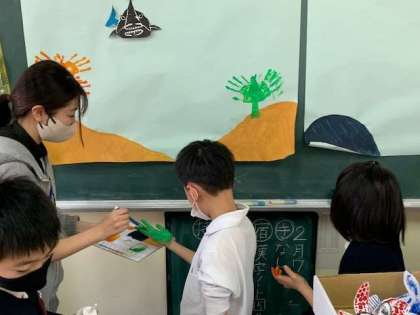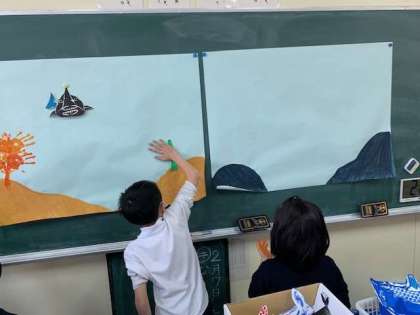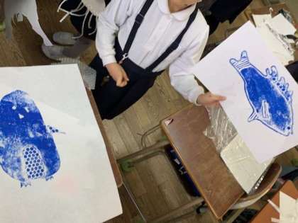 紙版画に挑戦です。海の中の生き物をイメージして、毛糸も使って表現していきます。