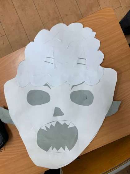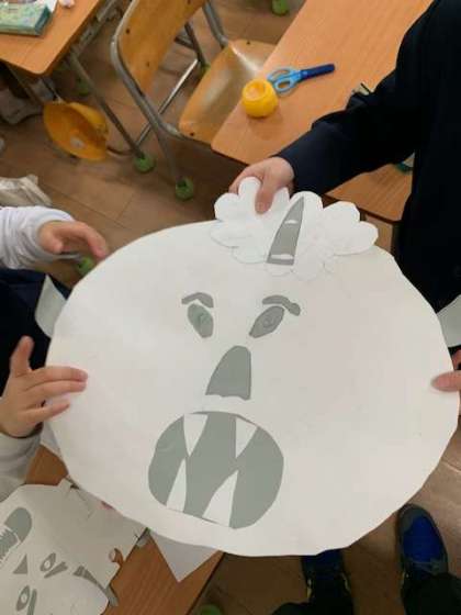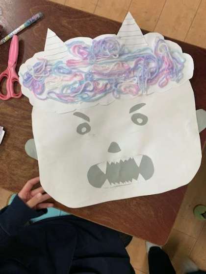 おにの顔を表現しています。毛糸を髪の毛のようにしている工夫もかわいらしい色使いをしています。