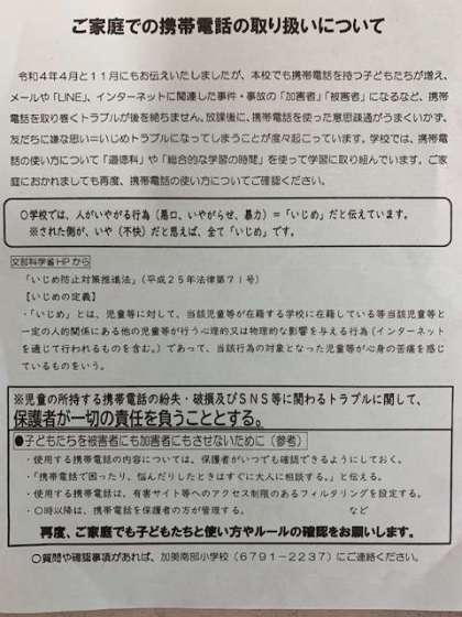 ご家庭におかれましても再度、携帯電話の持たせ方・使い方についてご確認ください。