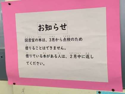 3月から蔵書点検のため借りることはできません。借りている本がある人は、2月中に返却をお願いします。