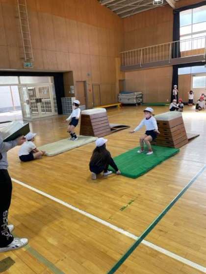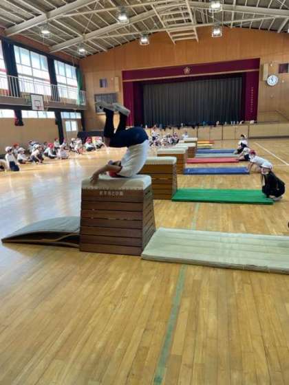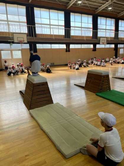 「跳び箱」で、台上前転をしていました。
