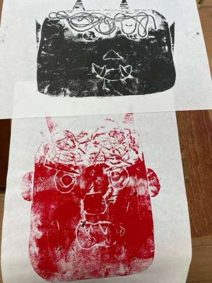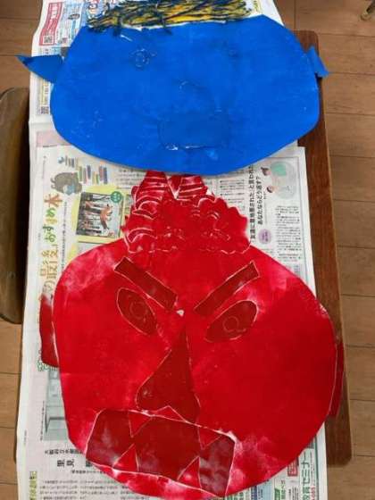 3年生が、鬼をイメージして赤や青や黒の「鬼の顔」を紙版画で作成しています。