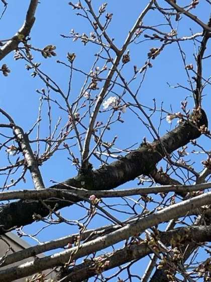 運動場にある桜の木の蕾が膨らみ、開花し始めてきました。
