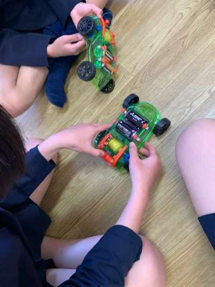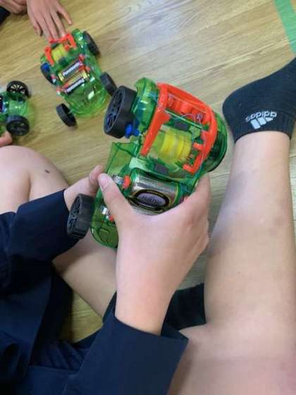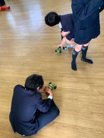 磁力を使って、車を走らせます。交流する電気のプラスとマイナスを生かしてるのですが、なかなか上手に回らなくて困っている子を担当の先生がフォローに入ります。