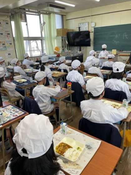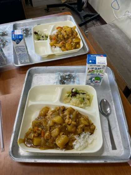 今日の給食のメニューは、「チキンカレーライス」でした。