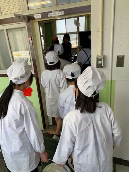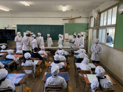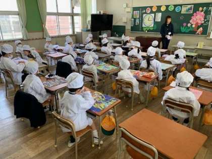 6年生が用意してくれるので、1年生はかしこく教室で6年生の用意する給食を待ちます。