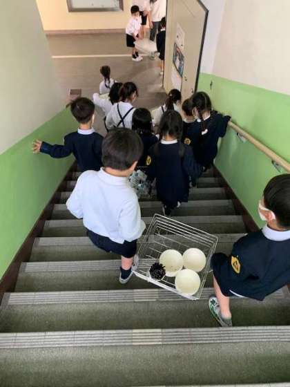 一緒に当番をする子と力と息を合わせて、給食室まで運びます。