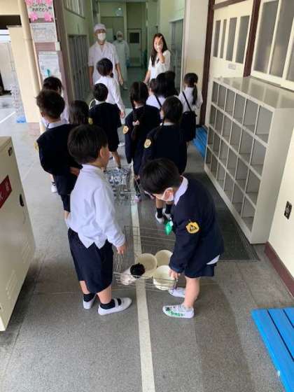 給食の用意は、ペア学年の6年生がしてくれますが、お片付けは自分たちで行います。
