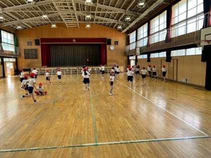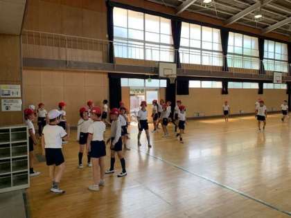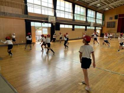 体育でおにごっこを行っています。新しいクラスでするおにごっこは、みんなとても盛りあがっています。
