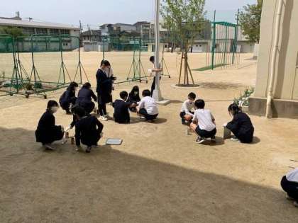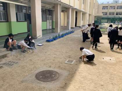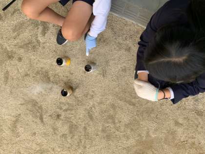 上部に穴を開けた缶、下部に穴を開けた缶、開けていない缶の3種類の中に燃えるものを入れて燃え方の違いを比べています。