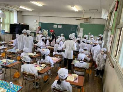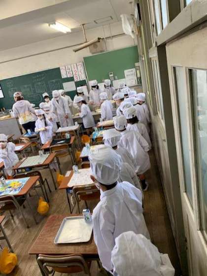 1年生も座って待つから、自分たちで取りに行く練習を行っています。