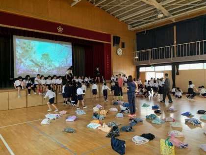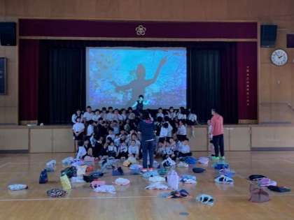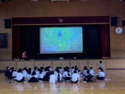 少しでも、気分を味わおうと体育館でプロジェクターを使って「お花見」です。