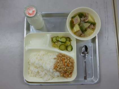 そぼろにはひきわり大豆が使われています。ひきわり大豆は北海道産の大豆を、ゆでてくだいたものです。大豆やたんぱくしつやカルシウム、鉄分、食物せんいがたくさん含まれています。