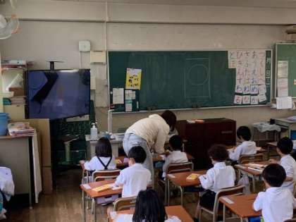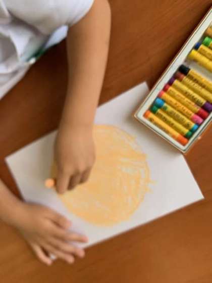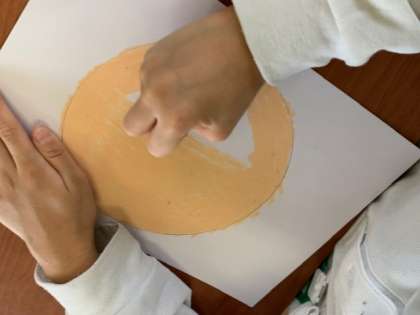 顔を描いていました。とても丁寧にうすだいだい色を、塗りこんでいきます。下地の白い画用紙が見えなくなるまでみんな一生懸命塗っていきます。