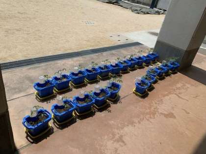 トマトの苗を植えました。大きな実がつくように観察しながら、水やりをして育てていきます。