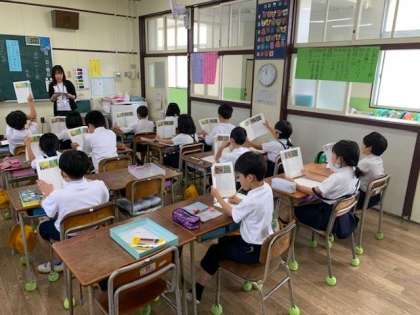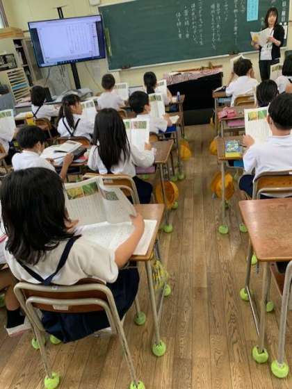本を読む姿勢が徹底されているようで、正しい本の持ち方で良い姿勢になることで声が出やすくなります。後ろから見ていても気持ちがよい雰囲気です。