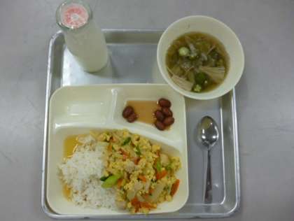 親子丼 すまし汁 金時豆の煮もの ごはん 牛乳