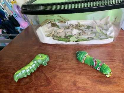 手前には、担当の先生が持ってきてくれた、幼虫の模型が置かれています。とってもリアルな模型で一目見ただけでは、びっくりしてしまうほどです。