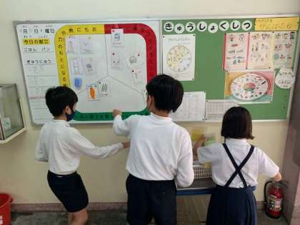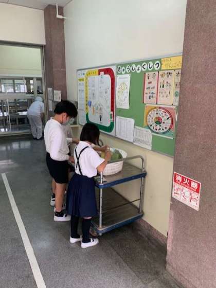 四年生から六年生までは、それぞれ委員会に所属しています。自分たちの給食を済ませたら、昼休み前にも関わらずお仕事にとりかかっています。毎日、給食の食品カードを委員会の子どもたちが、貼り替えてくれています。
