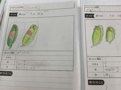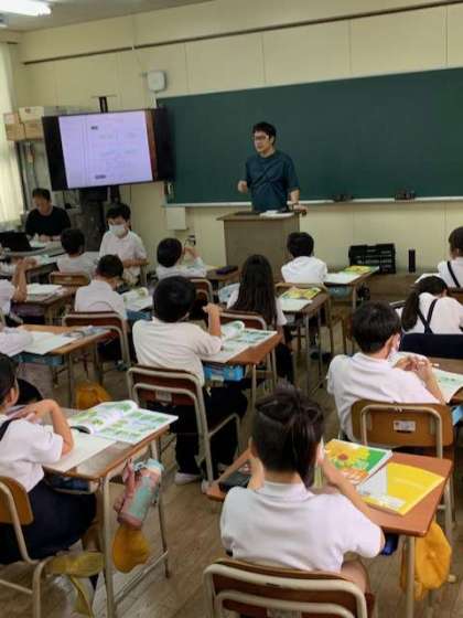 アゲハ蝶のサナギを観察、発表を行なっていました。言葉で表すのが難しい子どもは、絵で書き表すこともOKです。その後は、大型液晶画面で子どもたちが気づいていたこと、また気づけていなかったことを確認していきます。