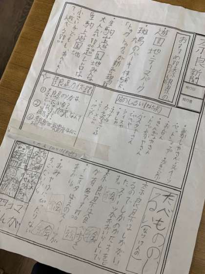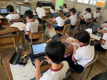 日本の都道府県を学習したあとは、自分で調べたい都道府県をタブレットで調べて「新聞づくり」です。少し前までは、調べ物をしに行く時は、パソコン室に移動して…でしたが、子どもたち一人一人がタブレットを片手に検索する姿ももう今や当たり前の景色になりました。