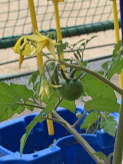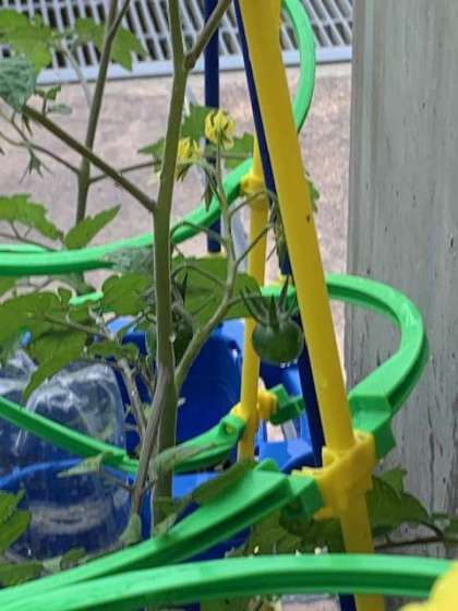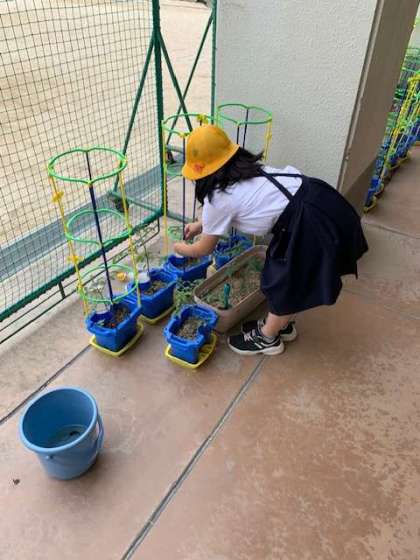 ミニトマトが、青い実をつけ始めています。1人の子どもが、「先生、花が咲いたあとに、実ができんねんで。」と教えてくれました。