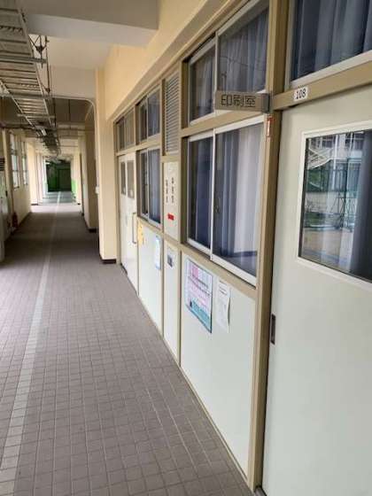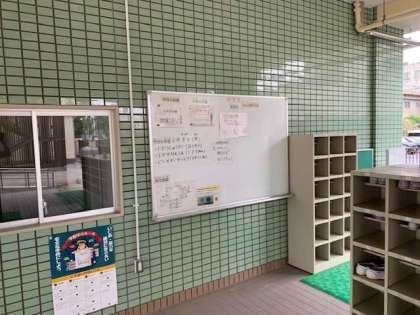 正門を入った靴箱の奥のホワイトボードには、