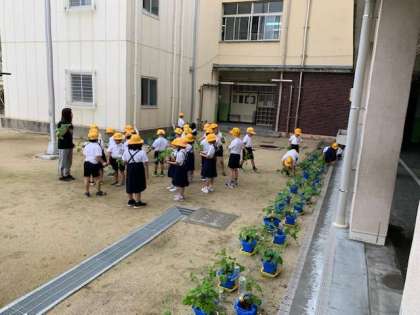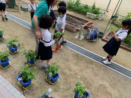 アサガオの鉢の間引きをしました。ある子の鉢は一株しか出ておらず、抜けない…と戸惑う子もいましたが、いくつも植えた種から元気な一本を残すことでより強いアサガオが育っていくことと思います。