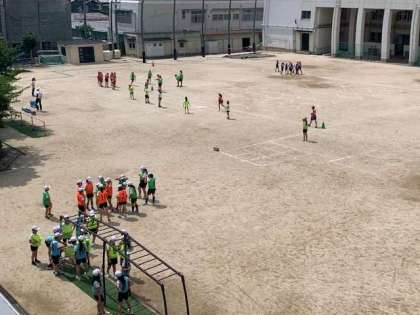 リレーに取り組んでいます。チームごとに確認・練習し、このあと対決です。各チーム、気合いが入っています。