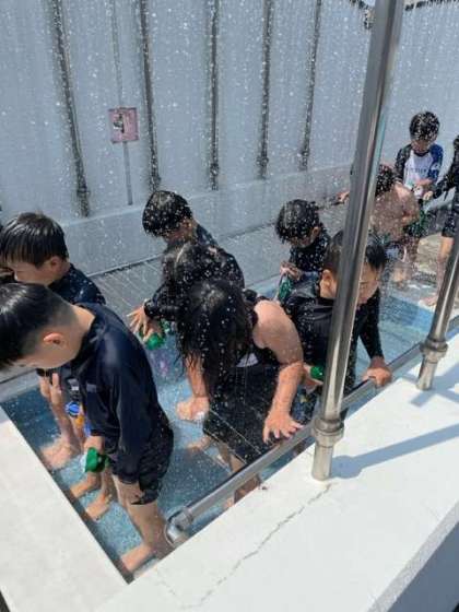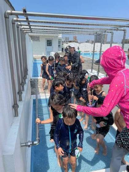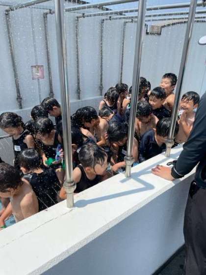1年生の初めてのプール水泳でしたが、今年はシャワーをこわがって泣く子は1人もいませんでした。
