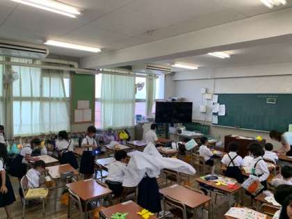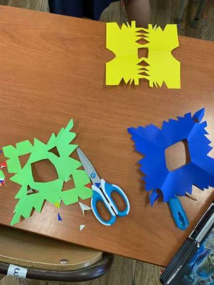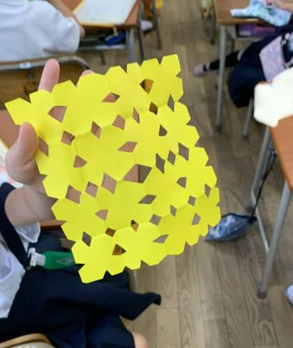 七夕に向けて、飾りを作りました。切り方が違うと、紙を広げると模様が変わります。教室に入ると、子どもたちは「見てみて」とたくさん見せてくれます。