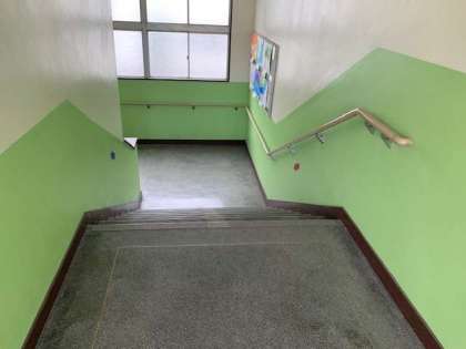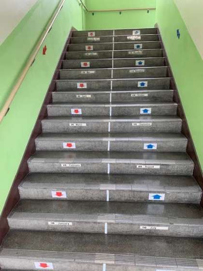 学校内は、右側通行です。わかりやすいように矢印↓↑をつけてもらってます。これで子どもたちもぶつかったり、こけたり、しにくくなります。