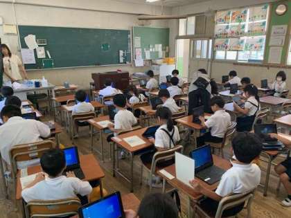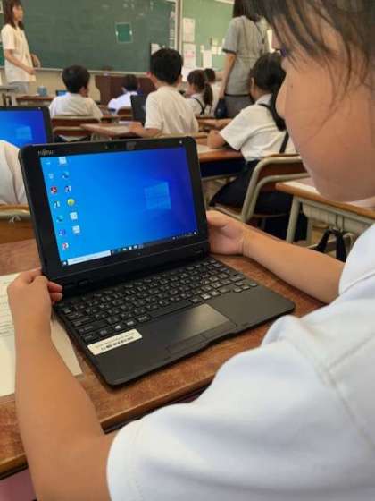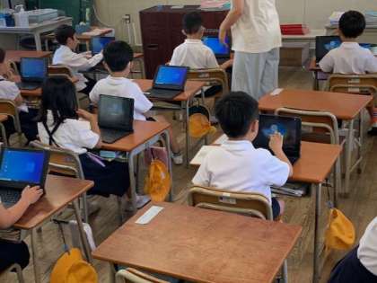 一年生も約二回目のタブレット学習です。まどまだ拙い手で、キーボードを押していきます。