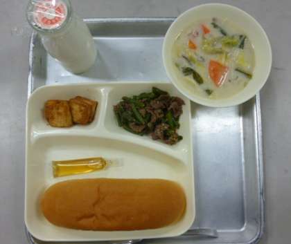 牛肉と三度豆のごまいため パン(コッペパン) 牛乳
