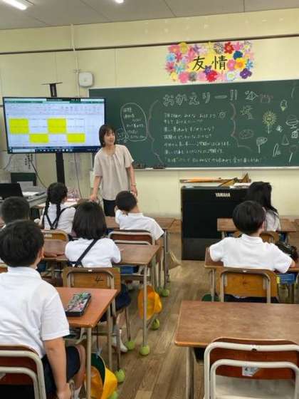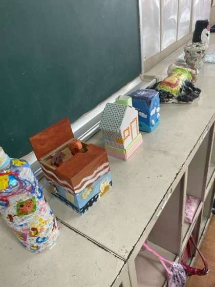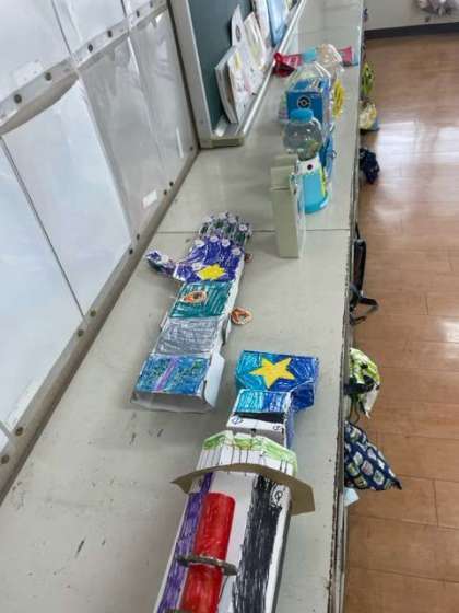 各教室の後ろのロッカーの上には、夏休みの自由課題の作品が並んでいました。
