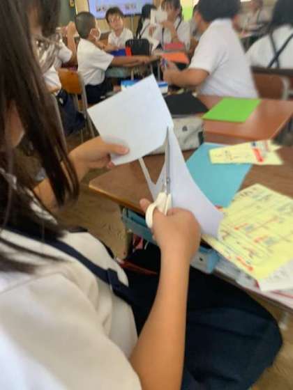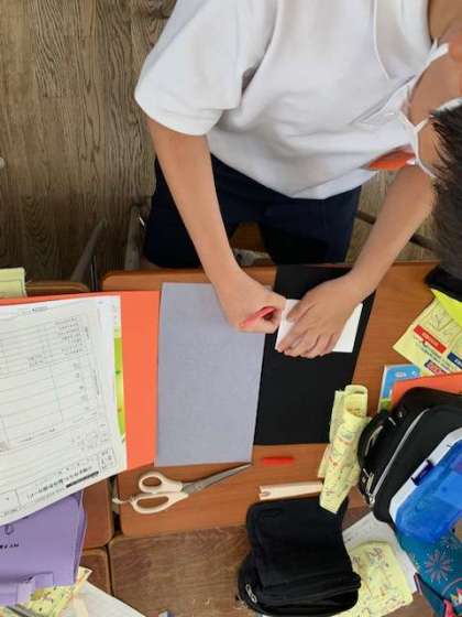 小物作りに取り組んでいます。みんな同じサイズの型紙から布を断ち切り、針と糸で縫い合わせていきます。上手にできるように、画像を確認しながら進めていきます。